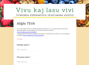 Ni ĝojas ke vi intencas membriĝi en TEVA kaj tiel fortigi nian asocion! Estas facile aliĝi al ni: sciigu viajn datenojn pere de la aliĝilo kaj pagu vian kotizon. La Sekretario sciigos al la Landa Reprezentanto pri la nova membro en ŝia/lia lando. Bonvolu ĉiam sciigi al la sekretario kaj Landa Reprezentanto (se ekzistas) pri adresŝanĝo por eviti ke ni sendu la bultenon al malĝusta adreso.